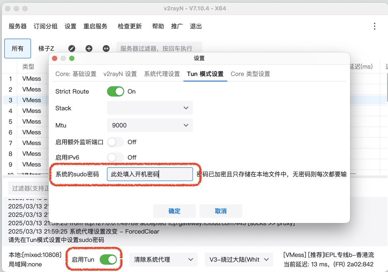 如果需要整个操作系统的所有应用都使用梯子, 开启Tun; 使用此功能前, 需要在设置 -> 参数设置 -> Tun模式设置 里填入开机密码